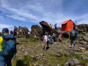 113号を進み山形蔵王ICから東北道に乗り、28日0時30分に近くの道の駅で仮眠する。5時に道の駅を出発、麓の岳から6時30分のシャトルバスで登山口の小田越へ。トイレを済ませて7時過ぎに登山を開始する。バスは満杯なので、登り初めは行列状態だが徐々にばらけてくる。反対側の薬師岳(1,645m)がたおやかな山容で静かに佇んでいる。朝日にハヤチネウスユキソウが輝き、振り返ると薬師岳がいつのまにか見下ろせる高度になっていた。途中の鎖場で若干の渋滞もあったが順調に9時に頂上に到着。頂上は多くのの登山者で賑わっており、また風も少しあったので我々は立派な避難小屋でお湯を沸かしてラーメンタイムとする。