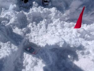 例年は1つの埋没ビーコンをみんなで一斉に探しに行く形の訓練をすることが多かったのですが、今年はたっぷりと時間を取って1人ずつ実施し、それぞれ2〜3回繰り返し練習しました。人の捜索を客観的に見ることによる学びも多かったのではないでしょうか。また、今回初めての試みとして、あえて20-50ルールを破った場合(スマホと一緒にビーコンを埋めたり、ビーコンをアルミホイルで包んだりした場合)についても捜索をしてみました。結果は、スマホの場合の誤差はせいぜい50cm程度でしたが、アルミホイルを巻いた場合にはもはや捜索不可能でした(ビーコン側にもエラーが出ます)。このような極端な状態は実際には起こりにくいとは思われますが、ビーコンの電波干渉には十分気をつけようと感じた実験でした。