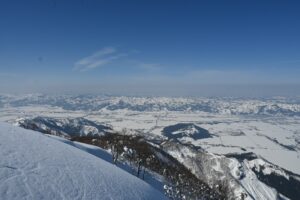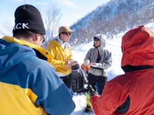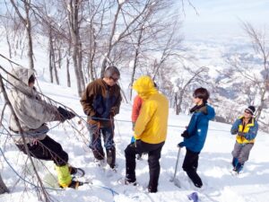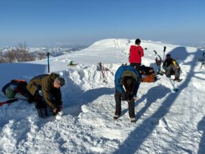 八海山ロープウェイで山頂駅まで上がり、少し歩いた場所でビーコン訓練を行った。リーダーからビーコンの基本的な説明を受けた後、山に入る際のチームでのビーコンチェックや、雪崩で人が埋没した状況を想定した捜索訓練を行った。ビーコンを雪の中に埋め、実際に探索して発見するという内容だったが、皆ピンポイントで見つけており、ビーコンの精度の高さを感じた(特に新しい機種)。