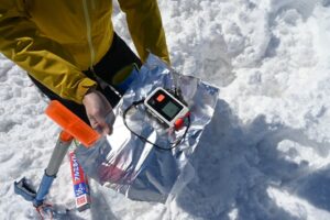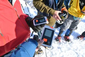 なかでも大変だったのが、雪に埋められたビーコンの探索練習。