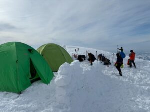 ビーコン講習と引き上げ訓練が終わった後はテントを設営し、日帰り組を見送った。設営を手伝ってくれた皆さんには感謝したい。